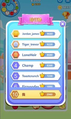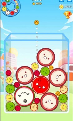 1、通过触摸屏幕来控制水果的落地位置。当两个相同的水果碰撞时,会合成一种更高级的水果。