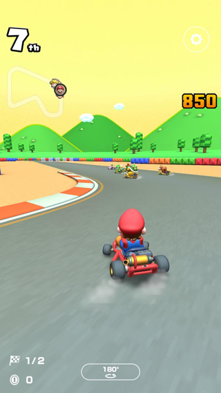 游戏开始时,玩家可以选择「简单」或「飘移」操作模式,但对于玩开《Mario Kart》的进阶玩家,应该对飘移加速(俗称擦火)不会感到陌生,所以理所当然是选择「飘移」!操作上亦很简单,只要向左或右扫来入弯时按实不放,便可以进行飘移及擦火;擦火可分为黄火、蓝火及紫火3段,只要在着火时放手便可以发动迷你加速。