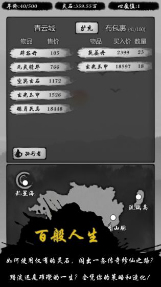这是一款不一样的模拟经营的单机修仙游戏!玩法简单有趣,你将使用仅有的灵石,依靠策略买卖物品,辟谷丹?筑基丹?玄光玉甲?各式各样的修仙商品,让你在感受赚取灵石乐趣的同时,不断突破自己的境界,成为一名强大的修士,最终能否在大限到来前登仙成为修真界的传奇,全凭你的策略和造化!