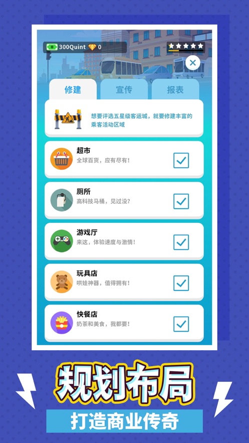 疯狂客运城是一款以汽车客运中心为主题的模拟经营手游,在这里玩家们可以发布广告,设立更多的新名目,吸引更多的乘客前往,赚取利润,扩大和装修自己的客运王国,感兴趣的玩家赶紧来下载疯狂客运城官方版试试吧。