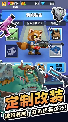 玩家可以控制主角浣熊,使用各种强大的武器不断消灭他们遇到的怪物。记住,怪物会从各个方向攻击,所以要小心,及时升级你的武器,以便成功通过关卡。