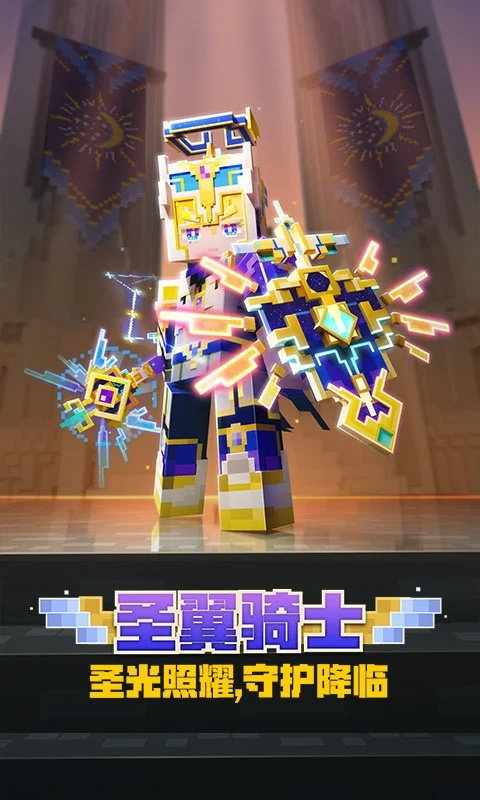 方块世界童话季开启,圣翼骑士主题抽奖上线!沐浴在阳光下,圣翼骑士头戴大理石光泽的白色头盔,身着金边蓝色盔甲,正义之姿一览无余。身后天使光翼展开,沐浴在阳光下,自身的神圣属性使他闪耀金光。手持由黄金和宝石打造而成的圣翼之辉,多形态圣剑帮助骑士战胜一切黑暗。冒险家们快加入光明骑士团,一起守护白日童话世界吧!