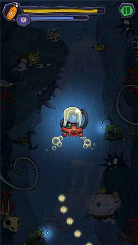 玩家用手指滑动屏幕,来控制潜艇的方向,在深海中进行探险,在探险的过程中会遇到各种敌人、陷阱,避开它们同时解救更多的精灵,获得更多的钻石,开启更多的水域。