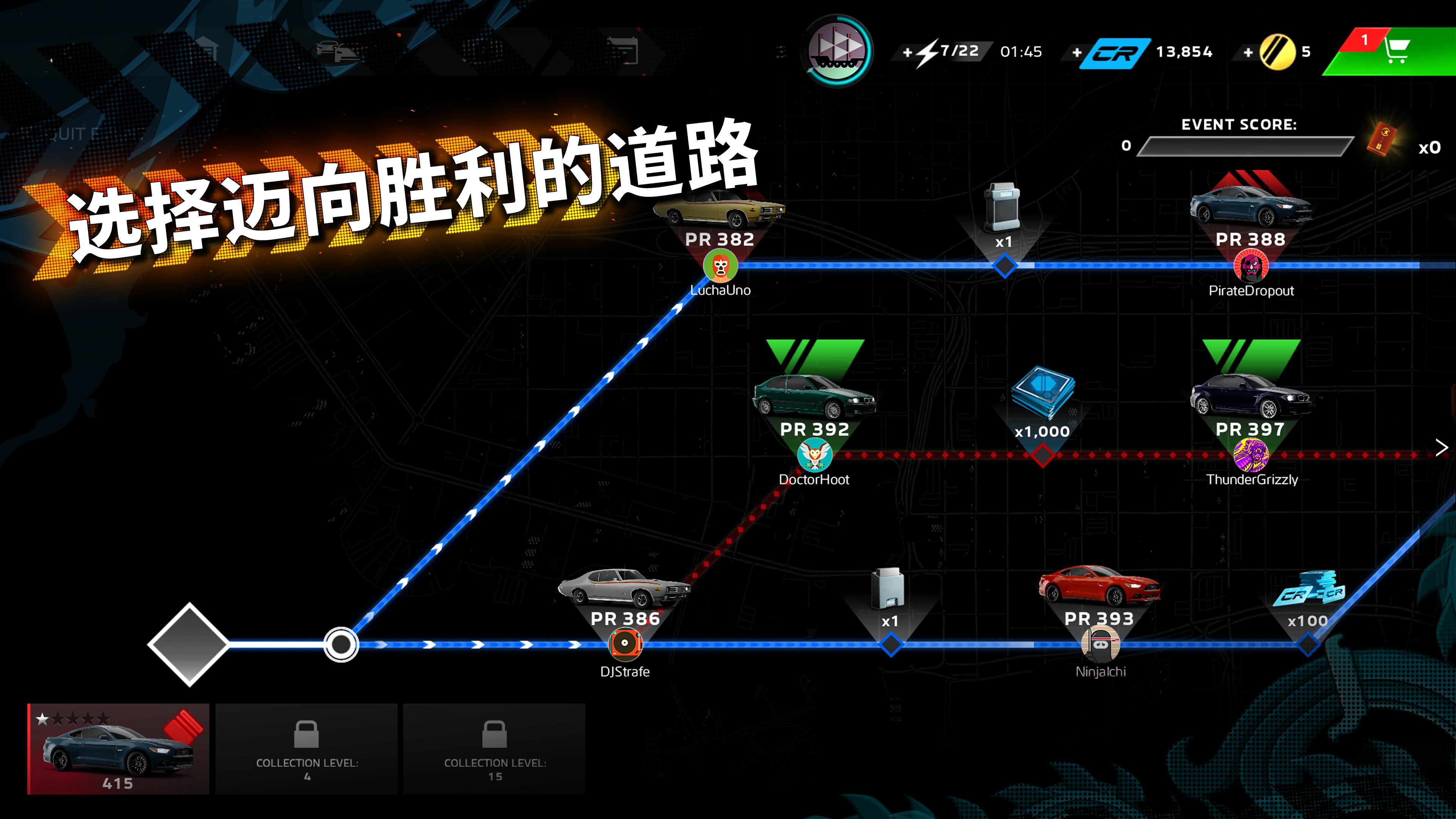 挑选一场赛事,从收藏中选择一组阵容,开始第一场移动版极限竞速游戏,一举成名。
