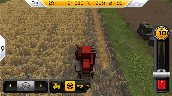 2、但如果你觉得自己的开车技术实在烂的话,小编这里可以教大家一个方法:先把收割机开到小麦附近,然后点击屏幕下方的“方向盘按钮”,这样收割机会自动收割小麦。