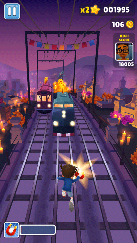 2、拾取跳鞋会让主角拥有两倍跳跃力,跳的更高更远,可以随意跳过障碍物和列车。