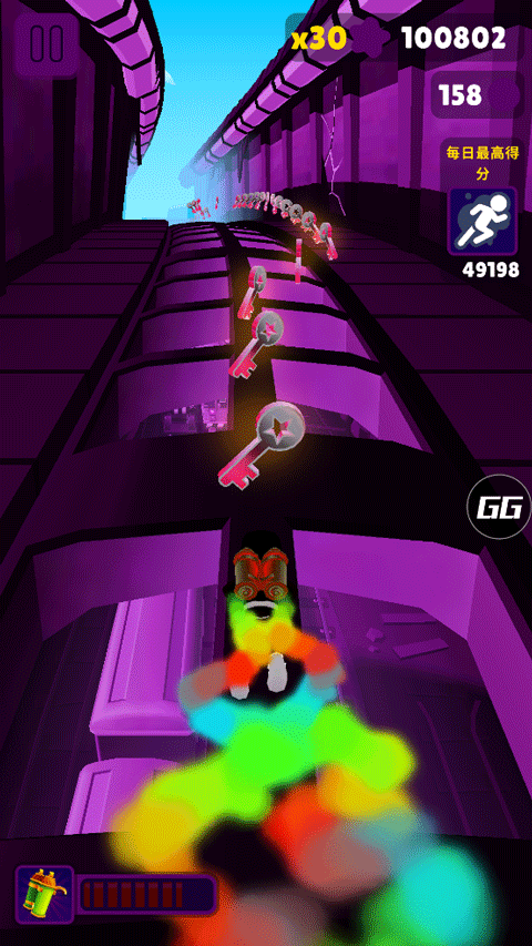 4、道具是我们跑酷路上重要的帮助,比如喷气背包,它会让你无敌一段时间还能拾取大量金币,当然也有高手故意避开道具,选择秀身法。