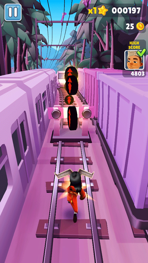跳跃的距离也不是一成不变的。在上坡的路段,跳跃距离明显会短很多,下坡的路段, 跳跃距离又会长很多。所以,在这些地方躲避障碍物的时候一定要把握好起跳的距离。(PS:地铁跑酷基本上都是在平地上或者火车上,部分路段也会有起伏)