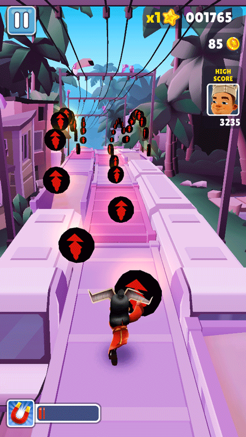 地铁跑酷很多道具都会对跳跃产生影响,比如跑鞋、助推器、跳跃道具等,特别是跳跃道具,可以跳到上方吃到很多金币,但是下落时,需要及时变更方向。