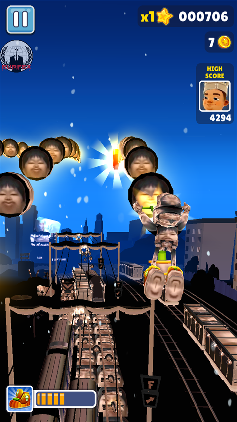 您是否被铺天盖地的地铁跑酷版本而不知道选择哪个版本而困扰吗?别担心,强者软件站在此为大家详细介绍一款非常珍贵的地铁跑酷版本-地铁跑酷郭继凯之城,这款全新的地铁跑酷是为地铁跑酷热门博主锅铲而定制的,当我们进入游戏之后就会发现,游戏内充斥着锅铲元素,无论是游戏加载页面还是游戏内的地铁、金币、还是场景等,都铺满了锅铲恶搞头像,意境十足,同时再配以奇特的背景音乐,让我们在跑酷的途中感受到轻松愉快的感觉。除此之外,地铁跑酷郭继凯版本是以圣诞版本为地图原型进行定制,保留了雪花与场景灯的特点,对游戏背景进行大改,这使整个游戏场景诡异十足但又不会觉得有违和感,极易促使玩家想继续玩下去,而且此版本还将众多角色和滑板进行魔改,包括黑白、彩色、纯色系等多种特征,大家可以进入游戏查看。