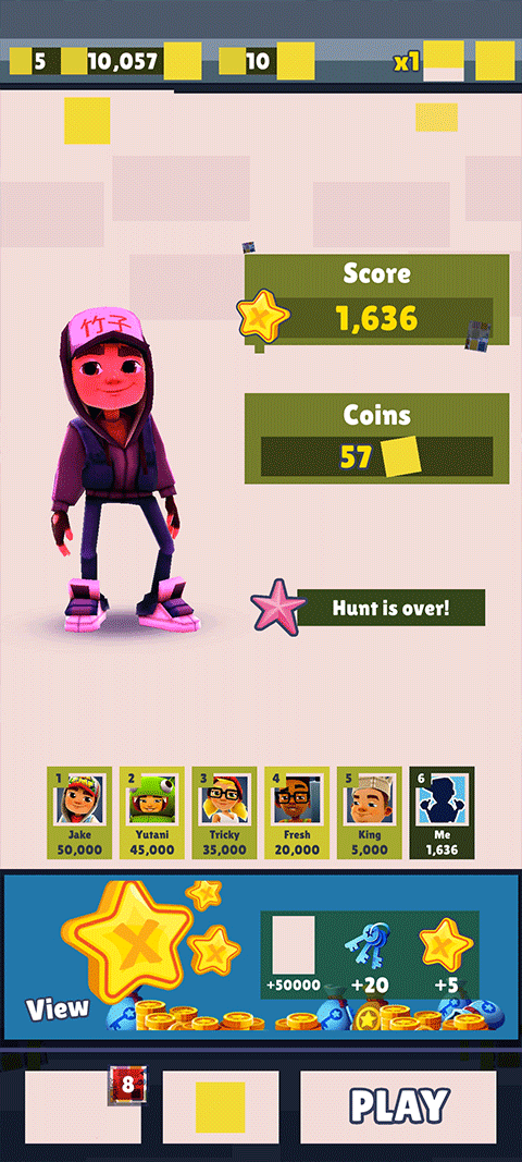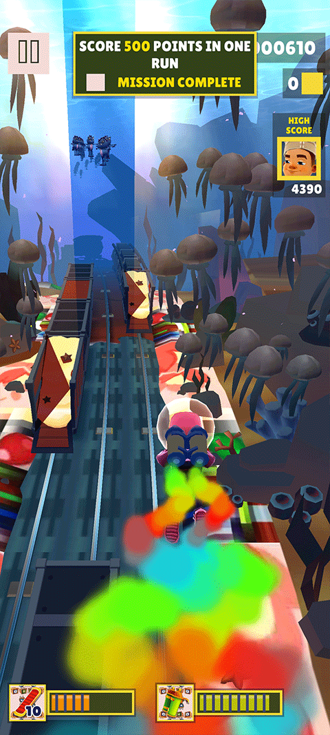 地铁跑酷竹子8.0版本是快手HC竹子根据热门休闲跑酷游戏《地铁跑酷》自制来的8.0专属版本,与原版不同的地方是,该版本加入了“竹子”水印,并且游戏金币全部修改成了小恐龙,搭配上海底世界的风格,场景非常令人震撼。而对于玩法上来说,在游戏内,玩家依然是以逃脱警察的追捕为开局,然后通过滑动屏幕实现主角跳跃(上滑)、翻滚(下滑)、改变道路(左、右滑),从而躲避各种障碍物和迎面驶来的火车,中途还可以随机获取到各种神奇的道具...不过这里的主角将自带竹子水印,还有专属的氧气罩,玩家在刺激跑酷的同时,可以尽情体验全新的游戏乐趣!还没玩过的朋友快来本站下载地铁跑酷HC竹子8.0定制版试试吧!