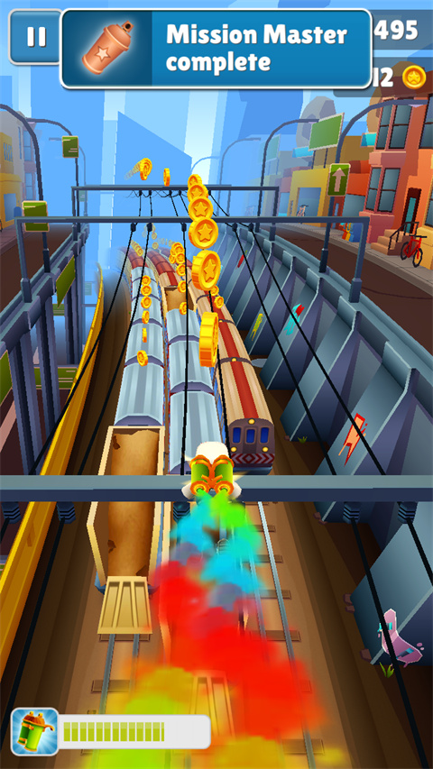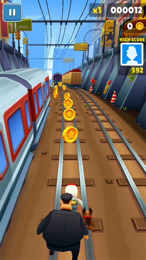 2、游戏中加入任务系统让游戏不会单调,多种的道具和角色也让人耳目一新,虽然有内购系统但不购买完全可以玩得很好。它几乎没有试图从其他无尽跑酷游的的模式中脱离出来,但很难不欣赏地铁跑酷对这个游戏赛道的贡献;