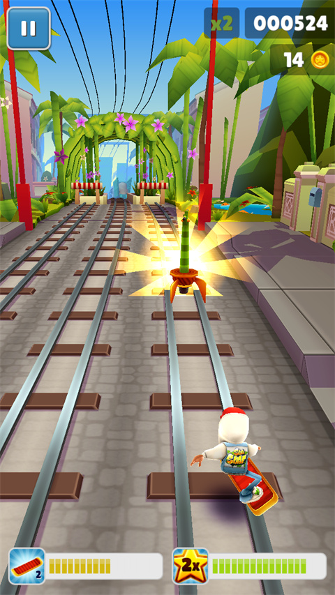 除了四处散落的金币之外,这次同样有许多道具等待玩家收集!玩家可以找到大幅提升弹跳力的超级跑鞋,或是能够冲上云霄的喷射背包,在触发之后,都能让游戏的乐趣加分不少,欣赏不同于地面的特别风光噢!另外,在关于我的选项,同样有充满个性的角色和独特的滑板能够解锁,玩家需要收集指定物资或是花费金币,来购入和更换衣物配色及属性:最后,在商店部分,玩家也别忘了开后神秘箱子抽取随机奖品,或是为游戏中会触发的道具,以强化的方式拉长使用时间噢!喜爱《地铁跑酷》游戏的你,快一起来畅游新加坡吧!