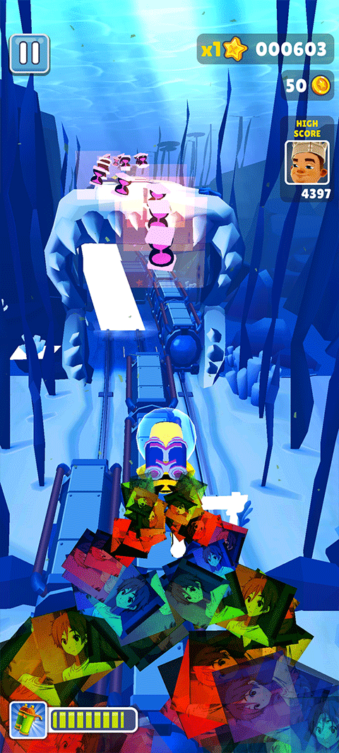 地铁跑酷最强恶魔版本指的是网络大神折翊根据地铁跑酷的制作的魔改版本,本作中除了拥有恶魔水印和恶魔道具,整个跑酷地图采用的也是深蓝色的深海世界,搭配上海底的鱼群,玩起来趣味十足!玩家可以在这里操控金色的小人,在地铁轨道上奔跑、跳跃、滑行等,避免障碍物和追捕者的攻击,收集金币和道具,感受独特的跑酷之旅!