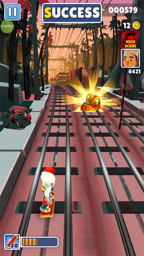滑板:通过双击屏幕来启动滑板,滑板会持续一段时间。在没有滑板的情况下,角色撞到火车或者障碍等都会被抓住,导致游戏结束。但在有滑板的状态下,角色就有了一道保险,撞到火车等的时候,滑板会消失,游戏可以继续进行。