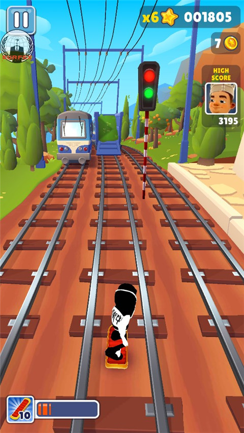 5、通过双击屏幕来启动滑板,滑板会持续一段时间。在没有滑板的情况下,角色撞到火车或者障碍等都会被抓住,游戏终结。但在有滑板的状态下,角色就有了一道保险,撞到火车等的时候,滑板会消失,游戏可以继续进行。
