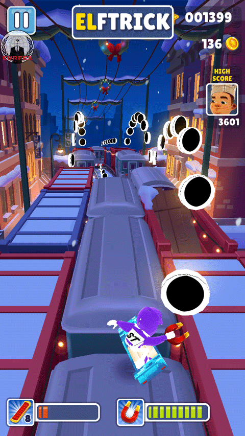 2、在列车上跑视野更开阔,往往比在地面上更安全,并且金币会指引你在列车之间跳跃。