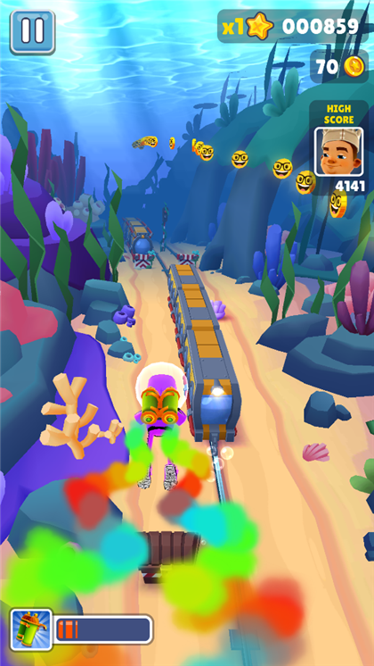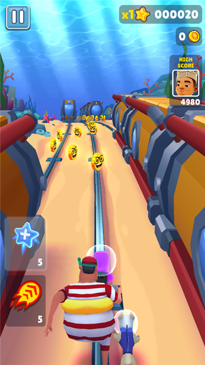 地铁跑酷水下城魔改版是一款由创之宇修改的深海专属版。这个版本的地铁跑酷沿袭了经典版的地铁跑酷玩法,你需要躲避想要抓住你的警察,躲避各种障碍,不断地往前跑。游戏中人物的颜色,金币的样式都被修改,给玩家新的游戏体验。在地铁跑酷水下城魔改版中,你需要在水底世界奔跑,通过左右移动躲避障碍不断地往前冲,来获得更好的分数,拾取更多的金币。金币等物品可以让你解锁更多的角色。你获得的分数会参与全球排名,整个世界的玩家一起,争相往榜上面冲!那个榜上面的人为什么不能是你?
