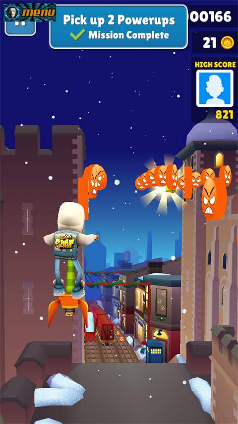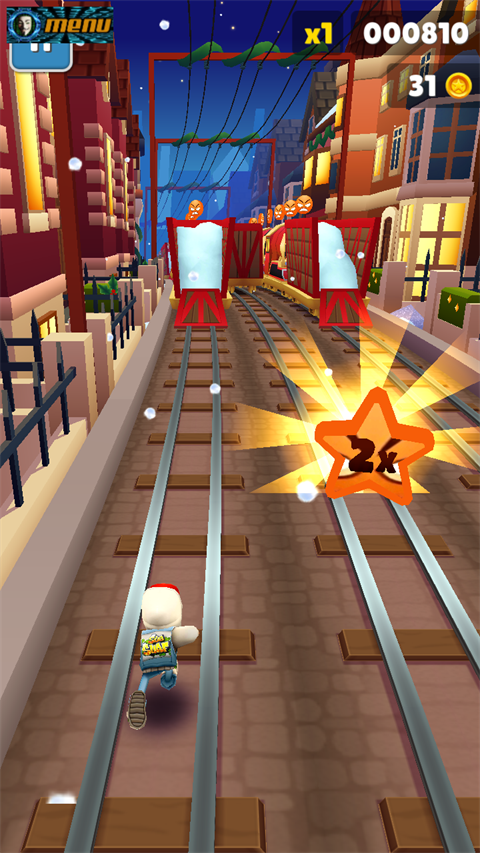 没有跳跃鞋从轨道上火车,在有路障的情况下,掌握好跳起的落点,在路障的上方下拉,使角色落在路障上可以再次跳起,然后就可以跳上火车顶了,相信大家都遇到过有个收集物品在火车上,却拿不到而错过的尴尬,掌握了这个技巧,问题迎刃而解。