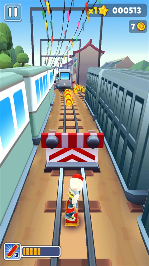 8、当你在3条火车轨道上接金币时,最后一辆火车速度是最快的。