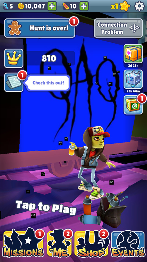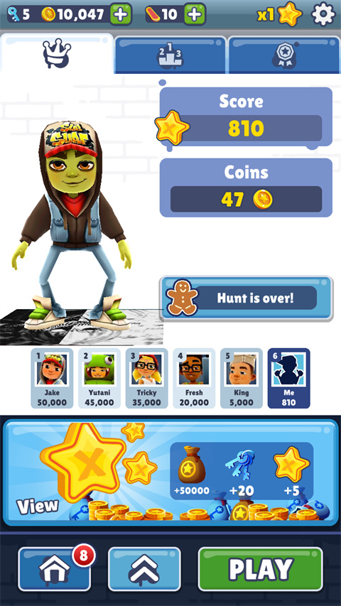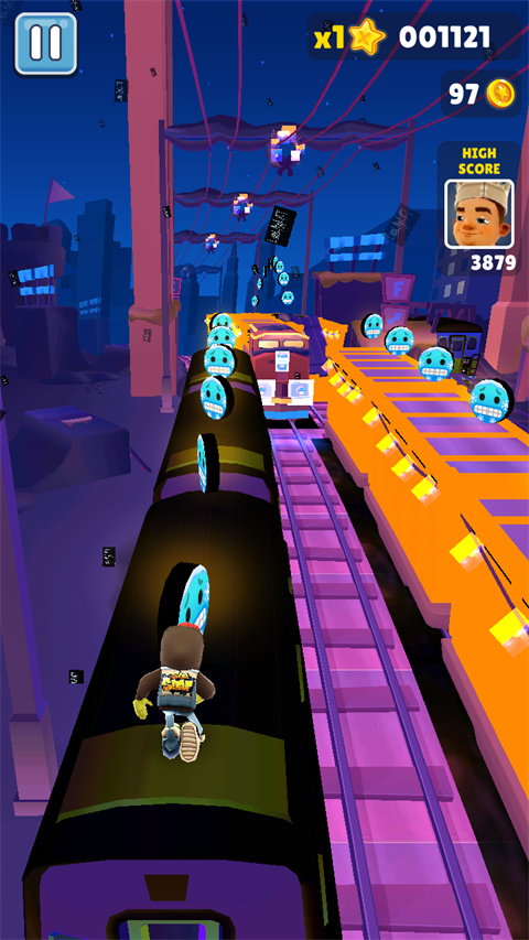 地铁跑酷eurfex版本是最新的一款地铁跑酷定制版本,游戏真名为(Subway Surf[EURFEX]3.5.0),下载进入游戏后,您会发现游戏的初始角色已经发生了改变,那是由网络大神特意修改定制的绿色版主角。不仅如此,当您开始游戏后,又会发现游戏内的金币与场景都发生了变化,游戏金币变为圆形浅蓝色冰冻表情,拾取之后在游戏结算页面会转变金币,趣味性十足,同时,游戏场景更换成了以紫色系为主的暗黑系地图,还有黑色的雪花飘落,并辅以动感压迫的背景音乐,给玩家一种阴森森的游戏体验。此外,游戏的玩法与主要特色还是与原版无差的,还是大家熟悉的跳跃翻滚和左右切换道路,躲避面前的障碍物和驶来的列车,如果你的技术够好的话,可以用这些简单的操作完成高难度技巧,所以只要玩过地铁酷跑的玩家,那么这款地铁跑酷eurfex版本一定能轻易上手。
