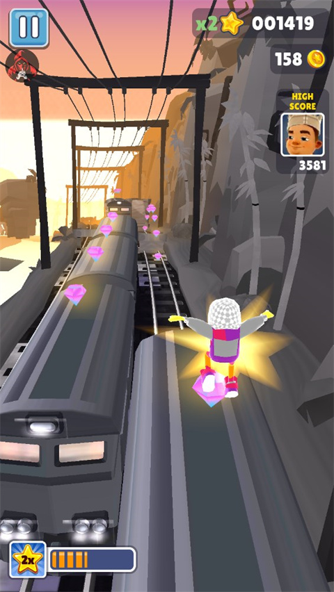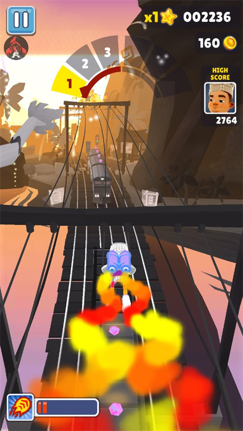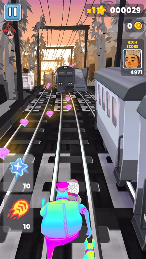 获得飞行背包后,在道具有效时间内,可在空中飞行,不会遇到障碍物及火车,但仍然可收集金币。