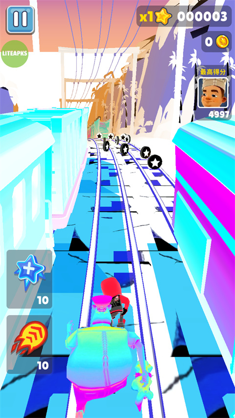 4、超刺激的游戏体验,躲避障碍物和追赶者,跳过高墙和地铁轨道等。