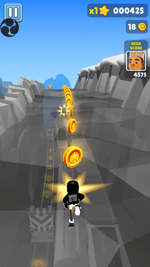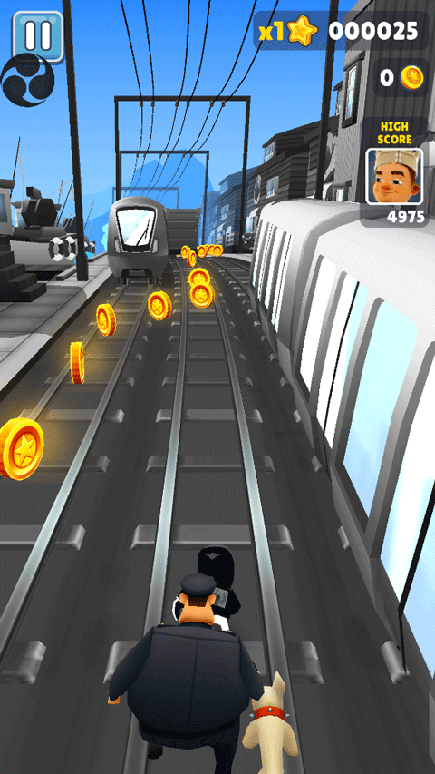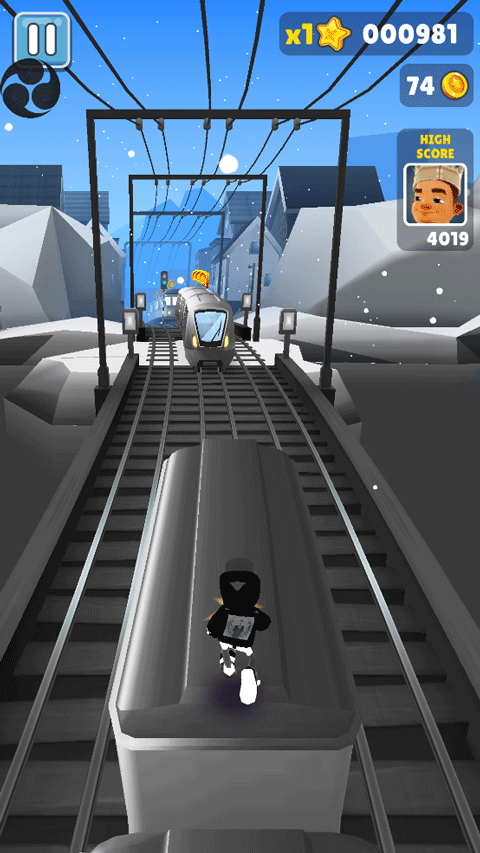 3、跑上列车时把握好时机起跳可以接力上后一辆列车,但是要注意,游戏速度会越来越快,也就意味着需要更早起跳