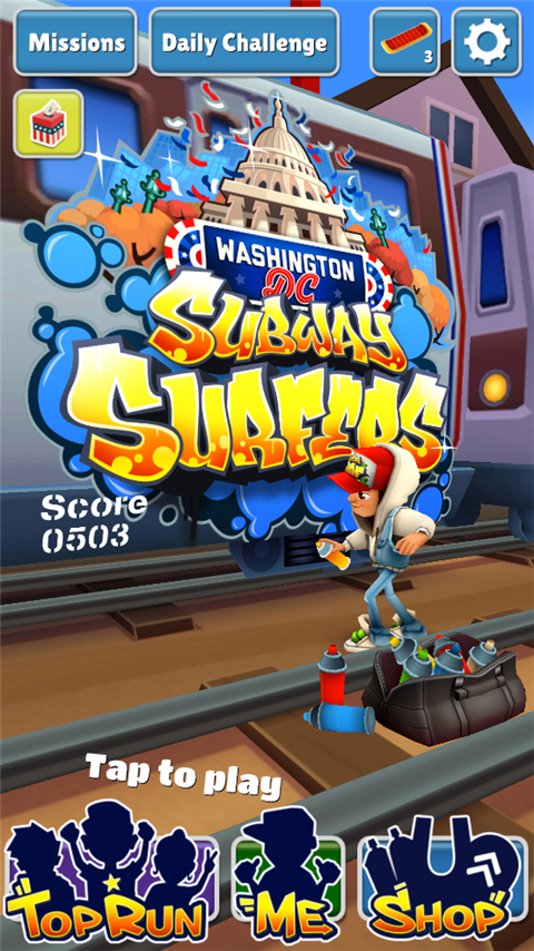 《地铁跑酷》(Subway Surfers)是一款由Kiloo和SYBO Games开发的无限跑酷游戏。游戏最初于2012年发布,适用于多个平台,如iOS、Android、Windows Phone等。《地铁跑酷华盛顿特区版》将带您进入美国的首都,探索华盛顿特区独特的城市风景和地标。在地铁跑酷华盛顿国际服中,您将扮演一名涂鸦艺术家,从一开始就在地铁轨道上冲刺,同时躲避警察追捕、跳过障碍物,以及收集硬币和特殊道具。