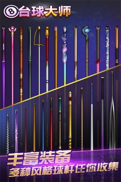 尖端巧粉,杆杆随心,游戏中配置多种属性、不同品质外形的球杆和球桌,超炫球技,彰显至尊身份。