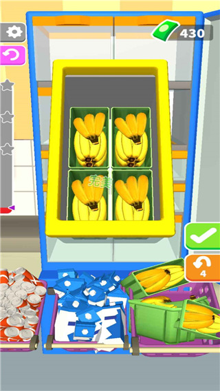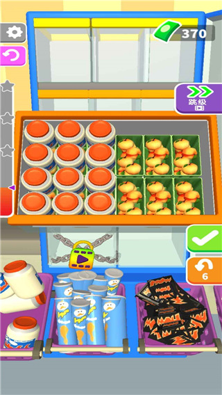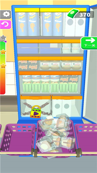 1、开始使用不同的物体、杂货、饮料和更多的物品在冰箱货架上进行填充。2、并尝试把它们全部装进去,一个接一个地清空你的购物篮。