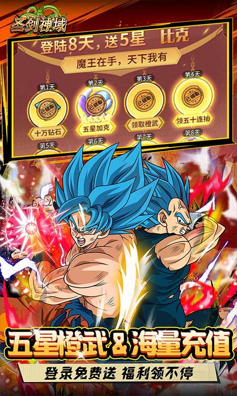 2、八日登陆送:五十连抽+五星比克大魔王+超强橙武+海量钻石,开局即起飞!