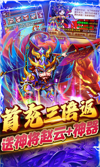3、充值比例1:1000,首充3倍元宝返利,首充即送极品神将【神赵云】,超强橙武,续充再送稀有红色装备。