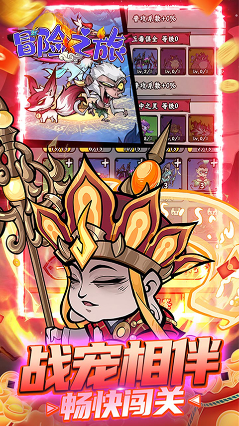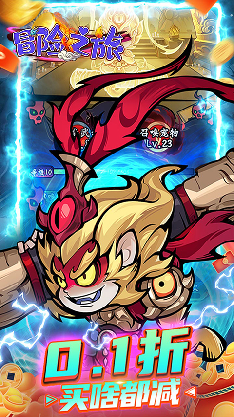 冒险之旅0.1折是一款折扣类放置开箱西游手游,游戏内有着丰富的福利活动,玩家上线就能获得永久0.1折福利,充值任意金额都能享受0.1折优惠,648仅需6.48,更有七日登录、新手礼包等免费福利可以领取,让你轻松提升战力,斩妖除魔。