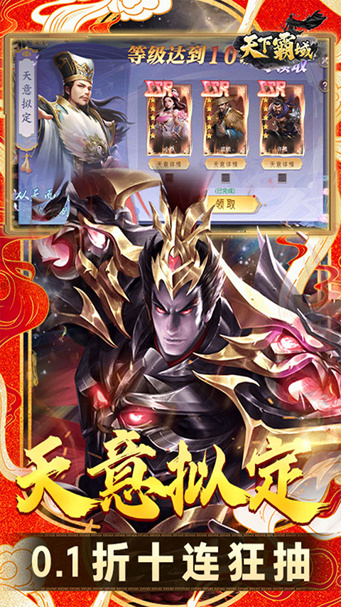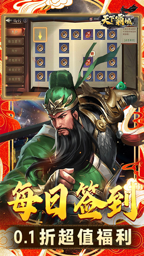 天下霸域0.1折手游是一款折扣类策略三国游戏,玩家进入游戏就能获得永久0.1折福利,充值比例1:100,648仅需6.48,首充仅需0.01就能解锁,领取百倍充值返利礼包,更有签到、在线、通关等免费福利活动可以参与,让玩家轻松获取各种资源道具,快速提升战力,成为三国霸主。