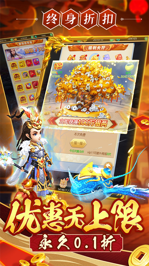 1、上线超多福利,百万元宝免费送,充值永久0.1折。