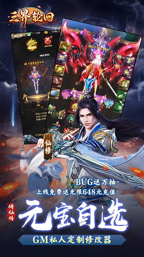 三界轮回0.1折是一款折类凡人修仙仙侠手游,玩家上线就能获得满级VIP、海量元宝等,充值还能畅享0.1折福利优惠,648仅需6.48,轻松解锁各种充值礼包,更有GM加持让玩家免费充值大量元宝,点点就能拿五十万真充,轻松提升战力,成为仙侠大佬。