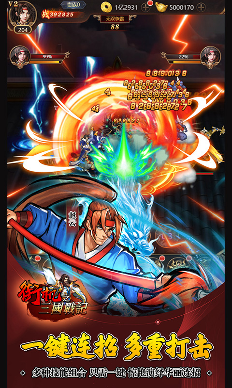 既有爽快的必杀技、连击玩法,让玩家在手游平台上,体验街机般热血战斗的乐趣;也有排兵布阵、武将克制,策略性丝毫不输传统卡牌手游。