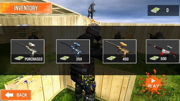 这是一种模拟真实枪战的游戏,分整两组在地图中对战,各自选择不同彩弹颜色,击中一定数量的彩弹就需要自动退出游戏,直到对方的人数为零即可获胜,而这款就是模拟这种玩法,但是你没有队友,你以一敌多,只有消灭所有敌人才能获取!