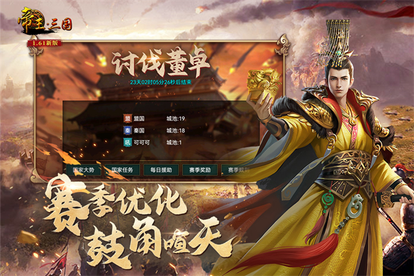 帝王三国九游版下载正式上线来袭啦!该版本经由九游平台客户端联合游戏官方厦门新游网络股份有限公司共同发行的一款大型三国题材策略类角色扮演手游,也可以说专为九游平台玩家量身推出,在支持用户通过九游,官方等双端账号登入畅玩,享数据互通使用便利的同时,更精心准备了海量专属豪华资源礼包等你来拿哦,还在寻找渠道资源的小伙伴们可千万别错过啦!另外回观至游戏内容中,帝王三国九游版更是采用了丰富的武将职业角色,恢弘的战场场面,多种多样的游戏玩法,搭配别具一格的战斗模式,能够带给玩家惊险刺激的三国万人国战体验,并通过自身灵活的头脑决策,招募名臣武将和千军万马,进行最强阵容的排兵布阵,与之一起征战沙场,完成三国统一霸业!