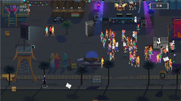 说到像素游戏,大家可以会想到的是马赛克一样的画面和让人爱不释手的游戏性,本次小编要给大家介绍的疯狂派对go这款游戏也是一样的,但是这款游戏在题材和玩法上更加大胆创新,突显疯狂。这是一款八十年代迪斯科风秘密谋杀冒险解谜游戏,游戏采用像素风格的画面,色彩背景十分鲜艳,可以为玩家带来视觉上的冲击,同时游戏中的音乐充满了上世纪八十年代迪斯科风,配合着游戏,将带给玩家十分动感的体验。游戏中玩家作为一名喜欢安静的单身人士,决定对在凌晨三点开派对的隔壁邻居发起报复。玩家要潜入派对现场,让那些吵闹的人们永远归于安静。玩家首先要观察好地形环境,之后选择合适的时机从背后暗杀他们,并处理好尸体。在完成任务之后,玩家还要躲避警察的追捕,这样才可以完美的通过关卡。在游戏中,玩家可以选择多种方式进行暗杀,除了可以选择悄无声息的用刀捅以外,玩家还可以选择在冰箱上做手脚使其爆炸,或者是在饮料中下毒,甚至是泼汽油放火。为了达到这一目的,你需要耐心等待、设计陷阱,并在秘密刺杀宾客之后不动声色地融入其它人之中。游戏非常有趣,可以为玩家带来沉浸式的体验感!