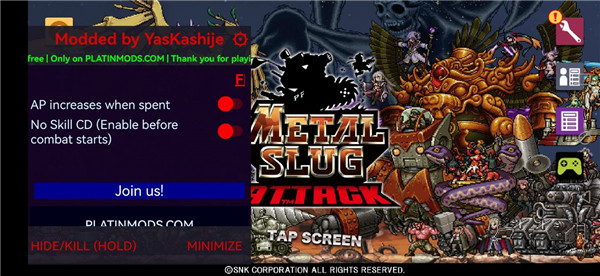 为了给玩家们带来更好的游戏体验感,小编特地为大家带来了合金弹头进攻内置修改器版,此版本已由网络大神破解完成,游戏内置菜单功能,包括ap使用会增加,技能没有冷却等功能,小编亲测有效,喜欢的玩家还在等什么,快来下载体验一下试试看吧!