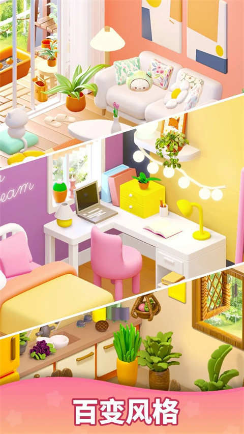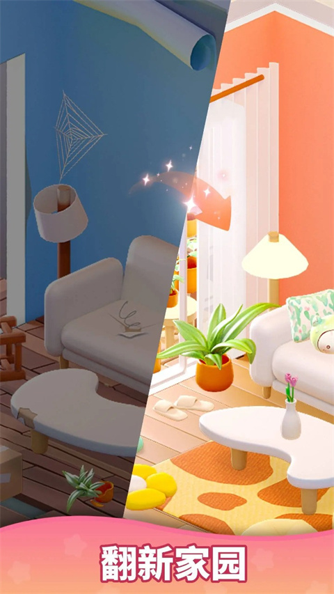 将拼图游戏板上的两个相同元素合并,创造新的物品和工具,以翻新客厅、卧室、厨房、花园和温室等各种房间;