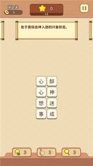 很多关卡,根据给出的解释从打乱的汉字中选取出正确的成语,没关有3次提示机会。
