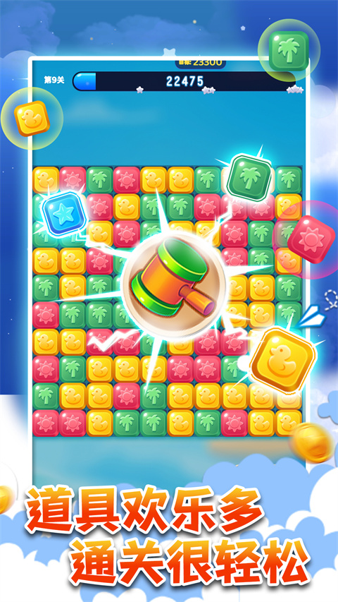 2、把三个颜色相同的小方块连成一条直线,消除获得分数,达到指定的目标即可通关。