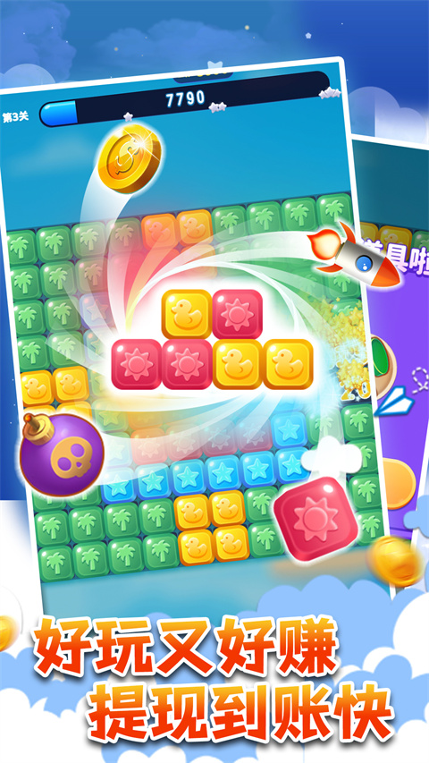 消除赚钱正版手游是一款休闲益智的消除类游戏。玩法简单易上手,游戏中你需消除相同的相连小色块,玩家轻松滑动手指即可操作,是您上下班坐地铁、坐公交期间打发时间的不错选择。消除赚钱正版手游亮点非常多,如看广告可获取游戏道具,道具可用于辅助玩家快速通关。甚至在游戏中完成签到、通关、完成任务、看广告可获取金币,积攒的金币可以用于购买道具。感兴趣的小伙伴欢迎到本站下载体验。