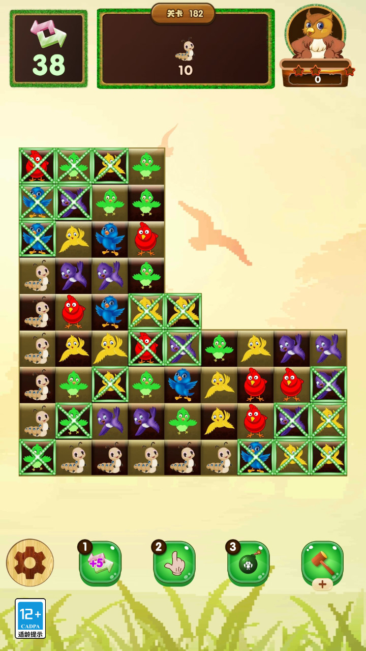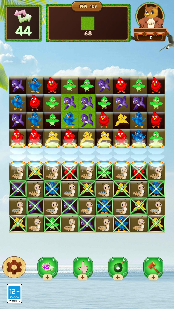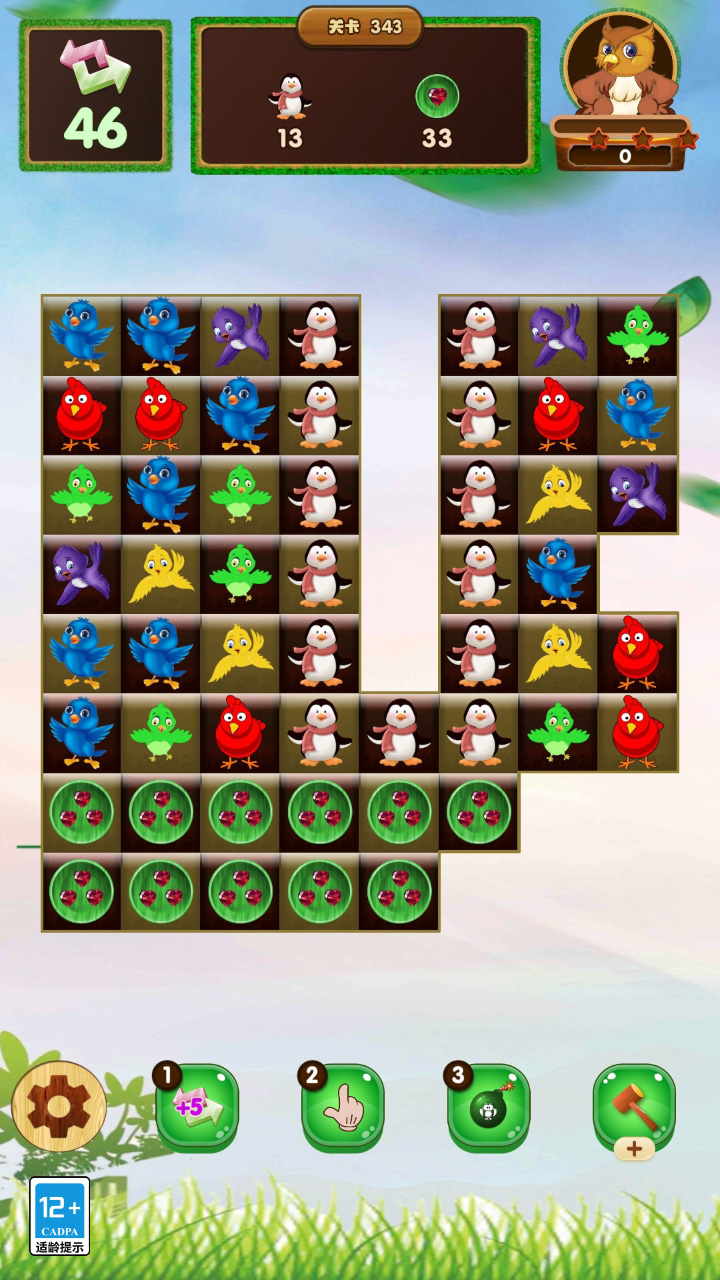 鸟友准备技能,只需要匹配3个以上元素,就会突然爆炸,随时被淘汰。