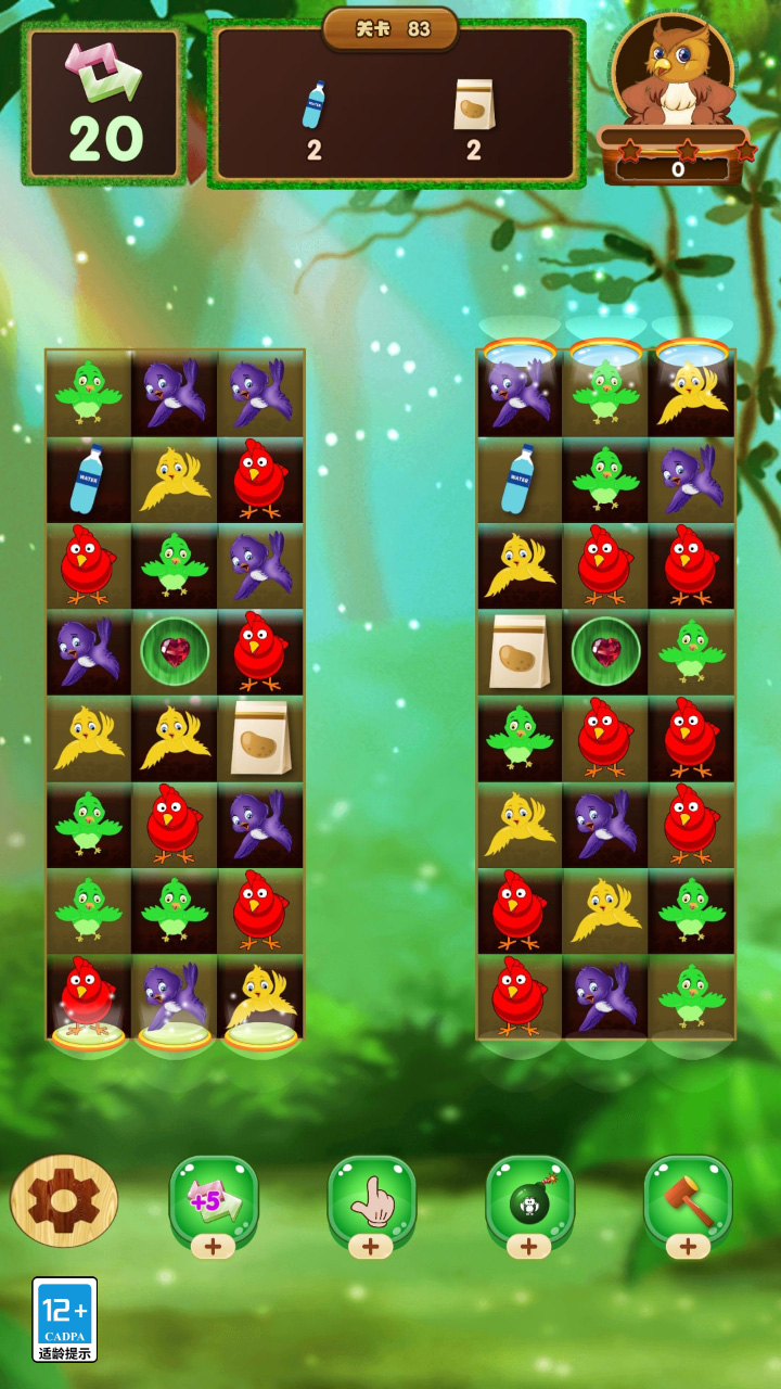 玩家要将颜色一样的小鸟通过上下左右的叫唤放到一排进行消除。