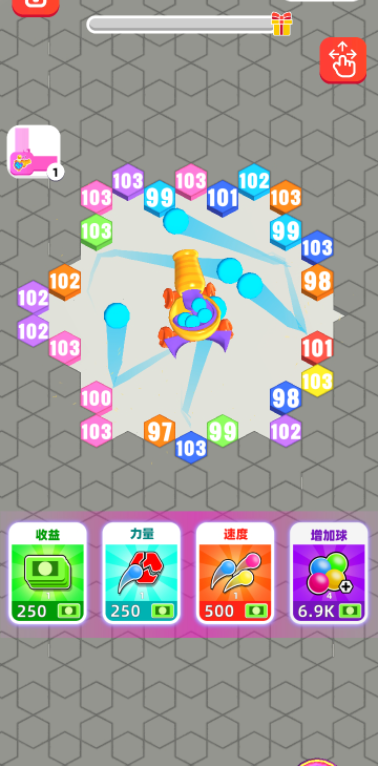 2、炮弹能够发射大量不同颜色的小球,只用一定数量相同颜色的小球才能够顺利消除。