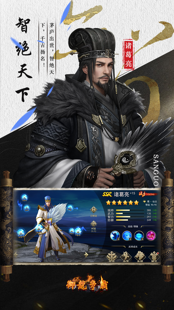 《御龙争霸》是一款真3D策略卡牌手游,游戏背景基于中国四大名著之一的《三国演义》,中国历史上、传说中乃至文艺作品中的各色英雄越过时代的限制,汇聚到同一个平台上来。玩家可以在游戏中实现与这些历史人物交流合作和携手征战,实现拯救乱世演义天下的宏伟的目标。也可以创建军团、开启领地,与志同道合的玩家一起协力征战,在乱世之中留下自己恢弘篇章。